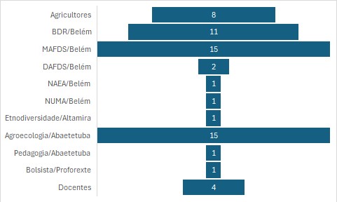 Conforme mostra o gráfico acima, a caravana contou com 8 agricultores, 4 docentes e 47 estudantes de graduação e pós-graduação e um bolsista do Porfor-Ext. Dos 27 estudantes de graduação, 11 são do curso de Bacharelado em Desenvolvimento Rural da Faculdade de Desenvolvimento Rural (FACDES) do Instituto Amazônico de Agriculturas Familiares (INEAF), 15 do curso de Agroecologia (Tecnológico) e 1 do curso de Pedagogia, do Campus de Abaetetuba. Dos 20 estudantes de pós-graduação, 17 são do Programa de Pós-Graduação em Agriculturas Amazônicas (PPGAA) do INEAF (15 do mestrado e 2 do doutorado), 1 do curso de mestrado do Núcleo de Altos Estudos Amazônicos (NAEA), 1 do curso de mestrado no Núcleo de Meio Ambiente (NUMA) e 1 do curso de pós-graduação em Estudos de Etnodiversidade, do Campus de Altamira. O bolsista que compõe a caravana é de um projeto de extensão, o PROFOREXT, do INEAF. Dos 4 docentes, 2 são do INEAF e 2 do Campus de Abaetetuba.