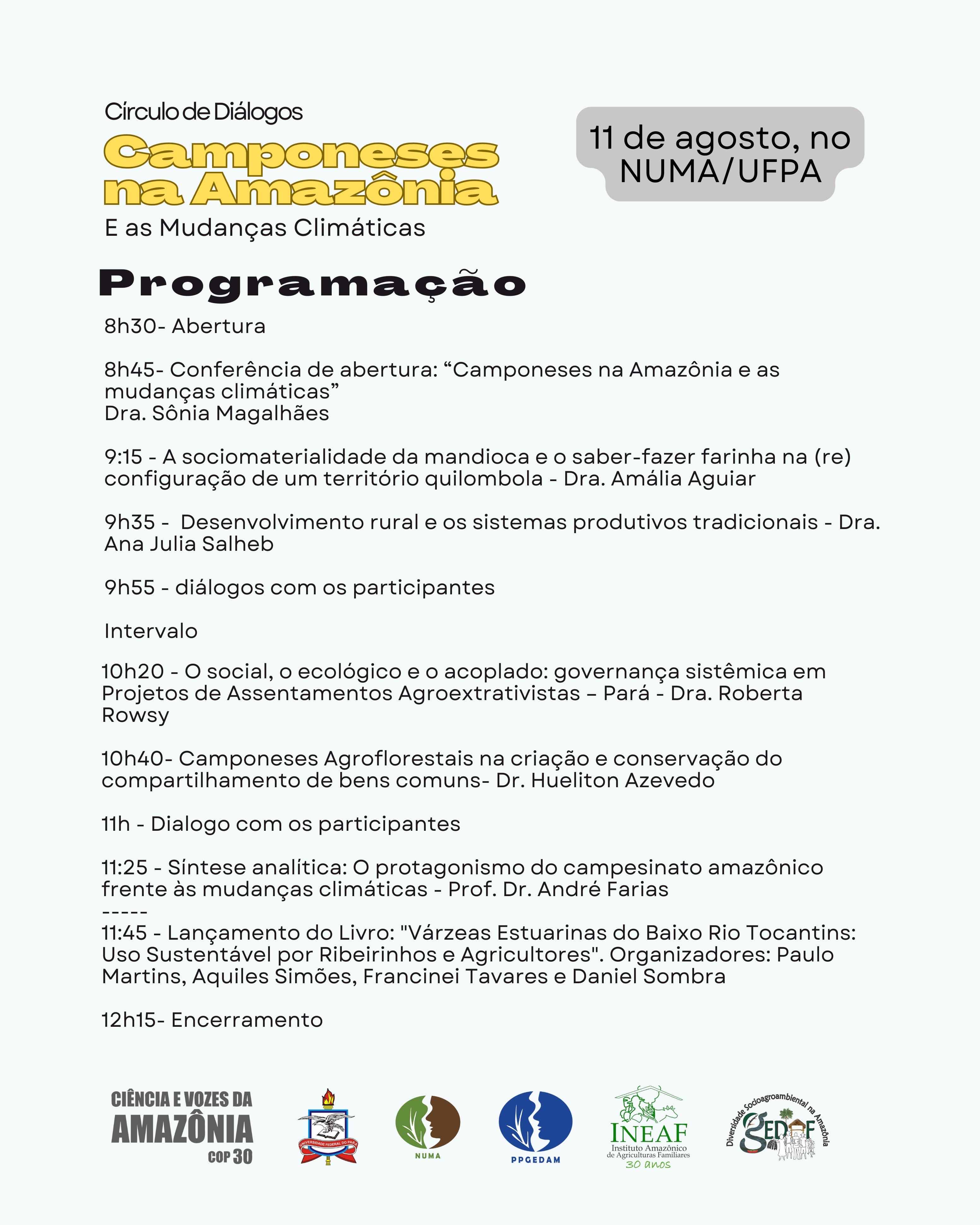 O evento é uma realização conjunta do Núcleo de Meio Ambiente (NUMA/UFPA) e do Instituto Amazônico de Agriculturas Familiares (INEAF/UFPA) através do GEDAF - NEA e integra a agenda Ciência e Vozes da Amazônia rumo à COP30.